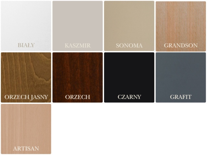 Elementy drewniane bejcowane i lakierowane - dostępne w wielu kolorach, odporne na ścieranie i uszkodzenia.