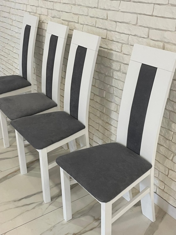 Krzesło wyróżnia się charakterystycznym smukłym oparciem, które nadaje mu lekkości i nowoczesnego wyglądu. Konstrukcja oparta jest na solidnym, stabilnym drewnianym stelażu w kolorze białym. Siedzisko oraz centralna część oparcia są wykończone przyjemną w dotyku tapicerką - jak na zdjęciu. Kolorystyka jest spójna, dodaje elegancji, a jednocześnie zapewnia komfort podczas użytkowania.